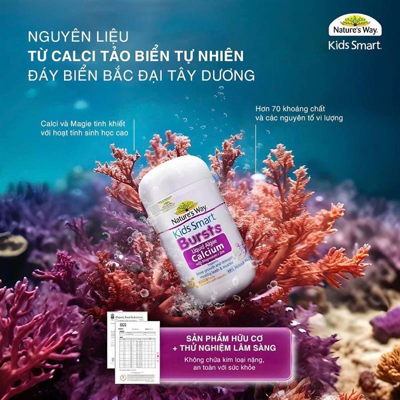 Canxi tảo biển Nature’s Way được bào chế dạng viên nang nổ (nhai làm vỡ lớp vỏ sẽ bùng lên vị ngon, thơm từ trái cây với lớp dung dịch bên trong) cực kỳ thơm ngon và hấp dẫn trẻ.
