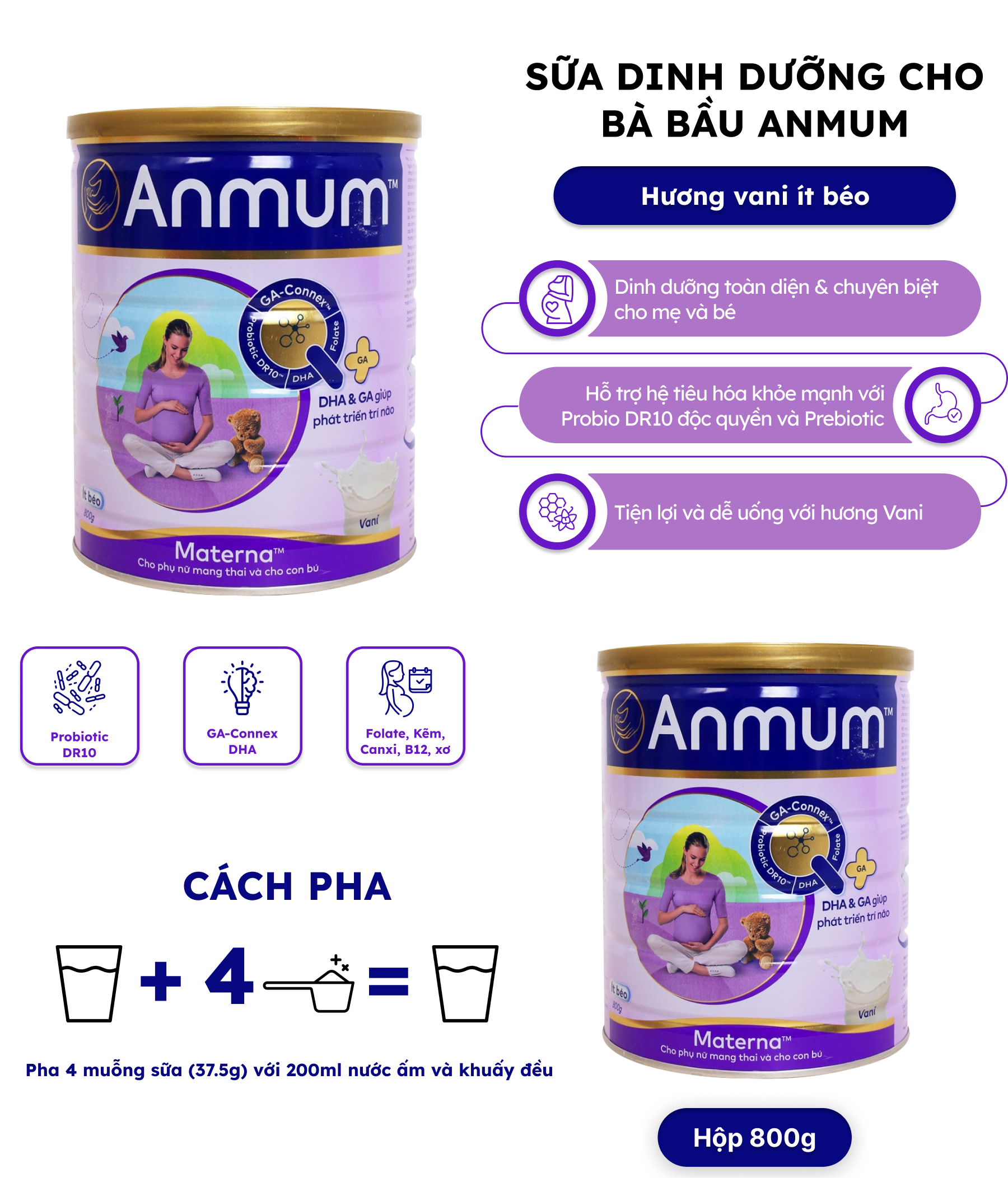 Sữa Anmum cho bà bầu là nguồn dinh dưỡng dồi dào cho cả mẹ và con. Chứa đầy DHA và GA, Anmum có hiệu quả cao trong việc phát triển trí não cũng như cơ thể của em bé. Nó cũng chứa sắt đóng vai trò trung tâm trong việc hình thành các tế bào hồng cầu, hỗ trợ cần thiết cho việc tăng 50% lượng máu trong thai kỳ. Ít chất béo, Anmum Materna hương vani là một trong những thức uống lành mạnh nhất cho phụ nữ mang thai và cho con bú. Sữa bột Anmum là loại sữa bột duy nhất dành cho bà bầu có chứa DR10. DR10 kết hợp với Inulin probiotic, cung cấp khả năng miễn dịch mạnh hơn và tiêu hóa khỏe mạnh.